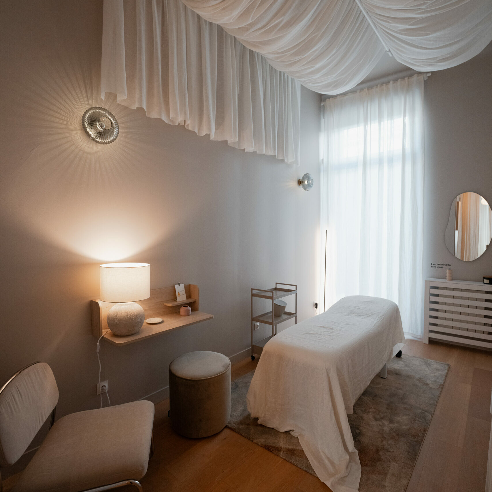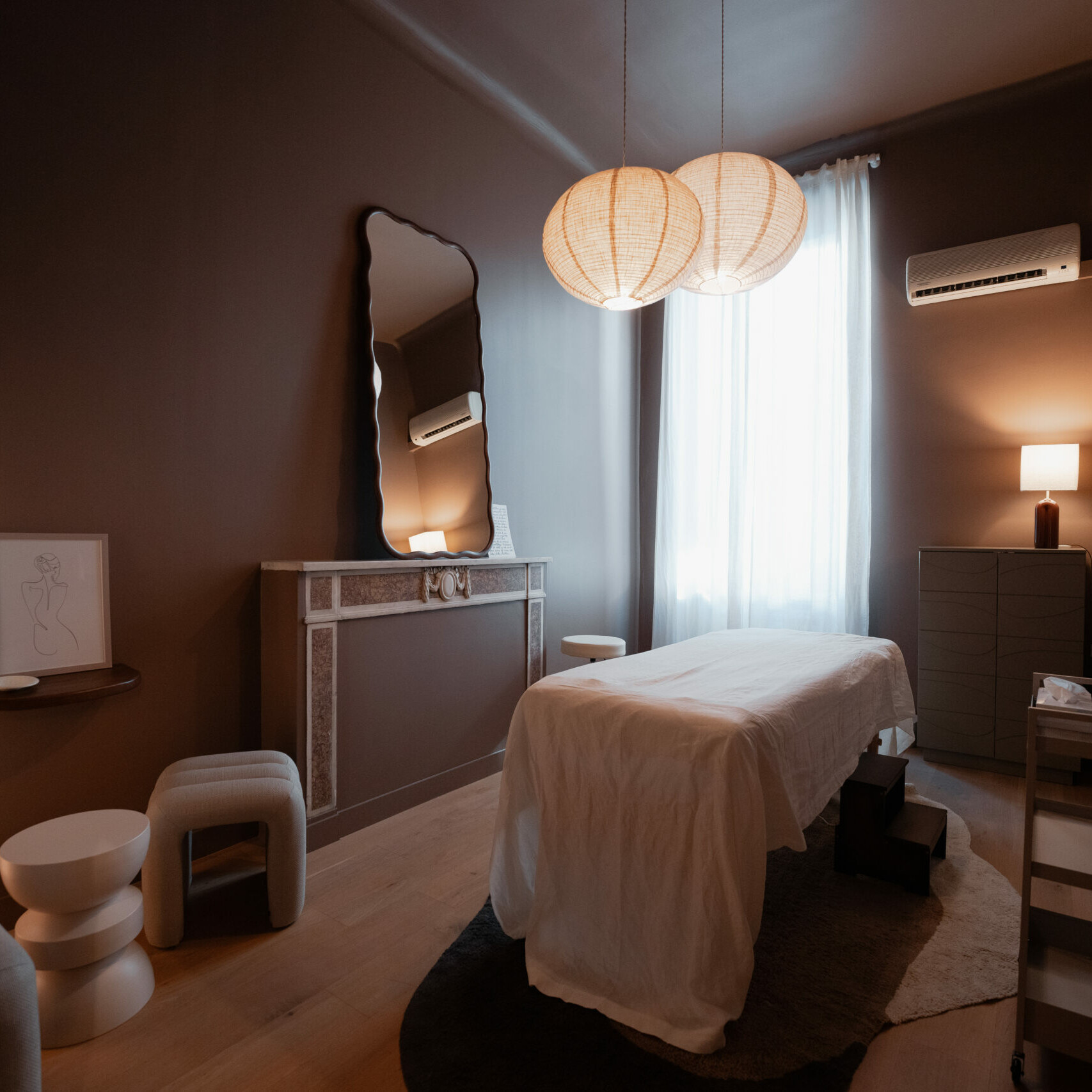 Pensée comme un havre de calme pour la fin de journée, cette cabine centrale se pare de tons bruns profonds (couleur Ombre) et de textures sableuses, évoquant la plage au coucher du soleil. Les murs sont habillés de dégradés rappelant les teintes du ciel crépusculaire, tandis que des voilages légers tamisent la lumière. L’éclairage est indirect, pensé pour favoriser le lâcher-prise : lampadaire diffus, appliques retravaillées, ambiance tamisée. Un mobilier en métal discret, et des assises confortables complètent ce cocon parfait pour des soins de recentrage.