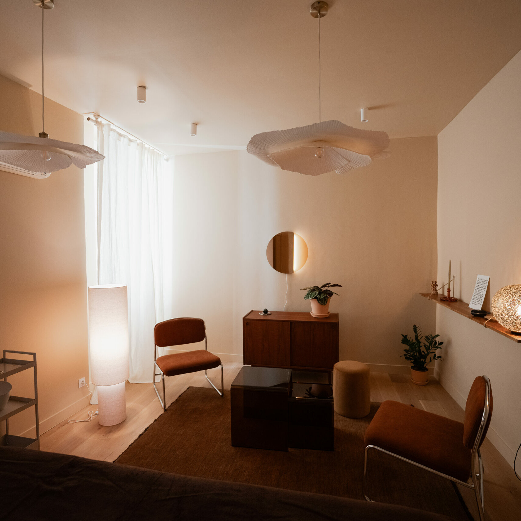 La pièce respire la quiétude : des matières naturelles, des tons sable et lin, une clarté apaisée qui filtre à travers les voilages. Tout semble pensé pour ralentir, pour revenir à soi, pour s’offrir une parenthèse de douceur.