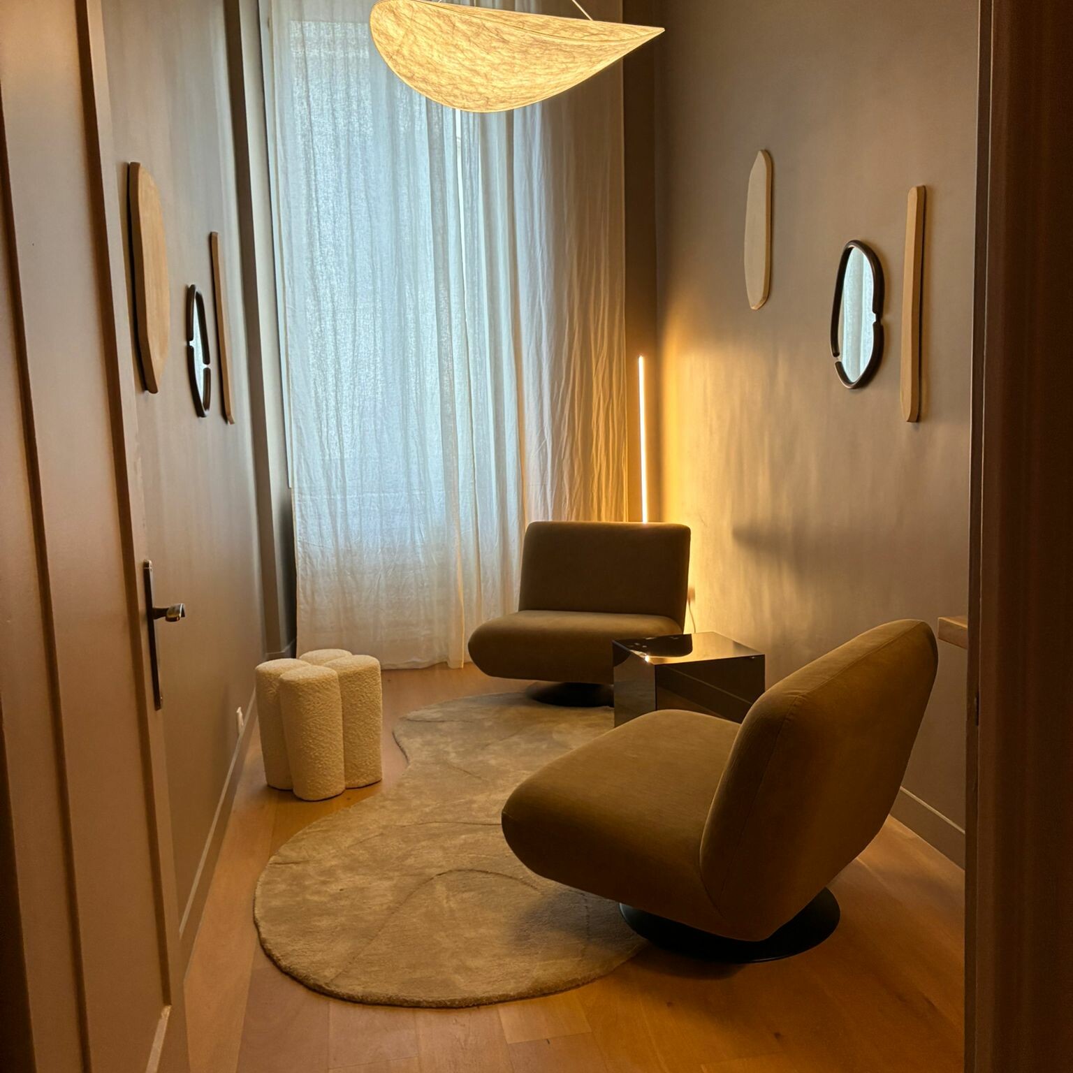 Cachée derrière une porte dissimulée, cette cabine confidentielle invite au rêve et à l’introspection nocturne. Parfaite pour les thérapeutes de la parole, elle mêle bois foncé, lin, sable clair et textiles doux. Les éclairages au plafond ont été entièrement repensés pour créer une ambiance feutrée. Rideaux muraux, canapé confortable, bureau élégant, et pouf d’appoint composent un véritable salon d’écoute, propice à l’ouverture. Un lieu enveloppant où le silence est doux comme la mer sous les étoiles.